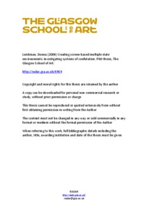 Creating screen-based multiple state environments: investigating systems of confutationLeishman, Donna (2004) Creating screen-based multiple state environments: investigating systems of confutation. PhD thesis, The Glasgow School of Art. |