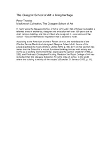 Trowles, Peter (2005) The Glasgow School of Art: a living heritage. In: Rhapsody 21C: The Future of University Museums amd Art Galleries in the New Century, 25-27 May 2005, University of Tasmania, Launceston, Australia.