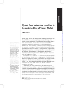 Lip and Love: Subversive Repetition in the Pastiche Films of Tracey MoffattSmith, Sarah (2008) Lip and Love: Subversive Repetition in the Pastiche Films of Tracey Moffatt. Screen Journal, 49 (2). pp. 209-215. ISSN 0036-9543 |