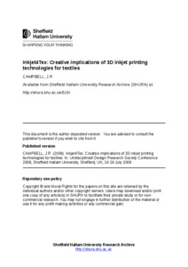 Injet4Tex: Creative Implications of 3D inkjet printing technologies for textilesBritt, H., Campbell, J. R. and Whittet, C. (2008) Injet4Tex: Creative Implications of 3D inkjet printing technologies for textiles. In: 'Undisciplined' Design Research Society Conference 2008, 16-19 July 2008, Sheffield, UK. |