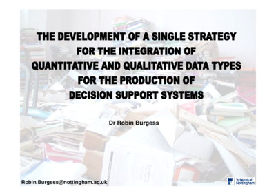 THE DEVELOPMENT OF A SINGLE STRATEGY FOR THE INTEGRATION OF QUANTITATIVE AND QUALITATIVE DATA TYPES FOR THE PRODUCTION OF DECISION SUPPORT SYSTEMSBurgess, Robin (2008) THE DEVELOPMENT OF A SINGLE STRATEGY FOR THE INTEGRATION OF QUANTITATIVE AND QUALITATIVE DATA TYPES FOR THE PRODUCTION OF DECISION SUPPORT SYSTEMS. PhD thesis, The University of Nottingham.Item not available from this repository. |