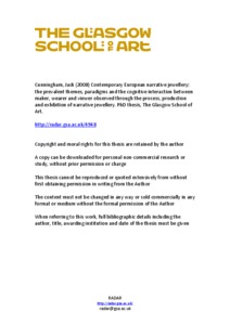 Contemporary European narrative jewellery: the prevalent themes, paradigms and the cognitive interaction between maker, wearer and viewer observed through the process, production and exhibition of narrative jewelleryCunningham, Jack (2008) Contemporary European narrative jewellery: the prevalent themes, paradigms and the cognitive interaction between maker, wearer and viewer observed through the process, production and exhibition of narrative jewellery. PhD thesis, The Glasgow School of Art. |