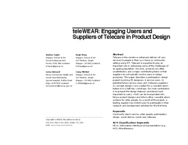 Taylor, Andrea, Bernard, Lorna, Pizey, Hugh and Whittet, Craig (2012) teleWEAR: engaging users and suppliers of telecare in product design. In: CHI 2012, 5–10 May 2012, Austin, US.