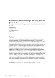 Bailey, Stuart G. (2012) Embedding service design: the long and the short of it. ServDes.2012 Conference Proceedings Co-Creating Services; The 3rd Service Design and Service Innovation Conference; 8-10 February; Espoo; Finland. pp. 31-41.