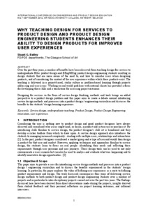 Bailey, Stuart G. (2012) Why teaching design for services to product design and product design engineering students enhances their ability to design products for improved user experiences. Design Education for Future Wellbeing. Proceedings of the 14th International Conference on Engineering and Product Design Education, Artesis University College, ANTWERP, Belgium 6th – 7th September 2012. pp. 795-800. ISSN ISBN 978-1-904670-36-0