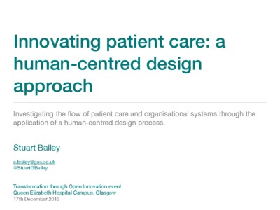 Bailey, Stuart (2015) Innovating Patient Care: a human-centred design approach. In: NHS Scotland and Scottish Enterprise’s Open Innovation Programme: Transformation Through Open Innovation Event, 17 December 2015, Queen Elizabeth Hospital Campus Teaching Learning Centre, Glasgow.
