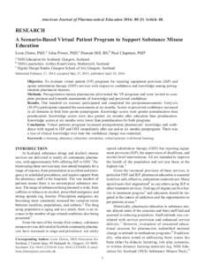 A Scenario-Based Virtual Patient Program to Support Substance Misuse EducationZlotos, Leon, Power, Ailsa, Hill, Duncan and Chapman, Paul (2016) A Scenario-Based Virtual Patient Program to Support Substance Misuse Education. American Journal of Pharmaceutical Education, 80 (3). Art 48. ISSN 0002-9459 |