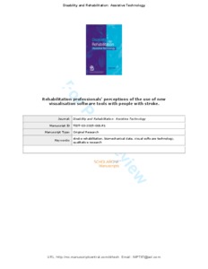 Rehabilitation professionals’ perceptions of the use of new visualisation software tools with people with strokeBallinger, Claire, Taylor, Anne, Loudon, David and Macdonald, Alastair S. (2016) Rehabilitation professionals’ perceptions of the use of new visualisation software tools with people with stroke. Disability and Rehabilitation: Assistive Technology, 11 (2). pp. 139-149. ISSN 1748-3107 |