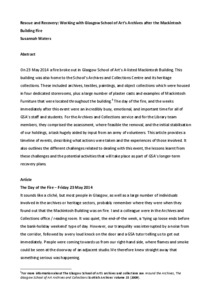 Rescue and Recovery: Working with Glasgow School of Art's Archives after the Mackintosh Building FireWaters, Susannah (2016) Rescue and Recovery: Working with Glasgow School of Art's Archives after the Mackintosh Building Fire. Scottish Archives: The Journal of the Scottish Records Association, 20. pp. 61-77. ISSN 1358-0264 |