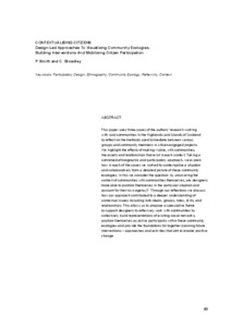 Contextualising Citizens: Design-Led Approaches To Visualising Community Ecologies, Building Interventions And Mobilising Citizen ParticipationSmith, Paul and Broadley, Cara (2016) Contextualising Citizens: Design-Led Approaches To Visualising Community Ecologies, Building Interventions And Mobilising Citizen Participation. In: MEDIATIONS: Art & Design Agency and Participation in Public Space, 21-22 Nov 2016, London, UK. |