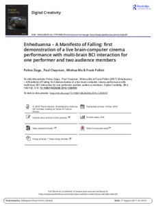 Enheduanna – A Manifesto of Falling: first demonstration of a live brain-computer cinema performance with multi-brain BCI interaction for one performer and two audience membersZioga, Polina, Chapman, Paul, Ma, Minhua and Pollick, Frank (2016) Enheduanna – A Manifesto of Falling: first demonstration of a live brain-computer cinema performance with multi-brain BCI interaction for one performer and two audience members. Digital Creativity, 28 (2). pp. 103-122. ISSN 1462-6268 |