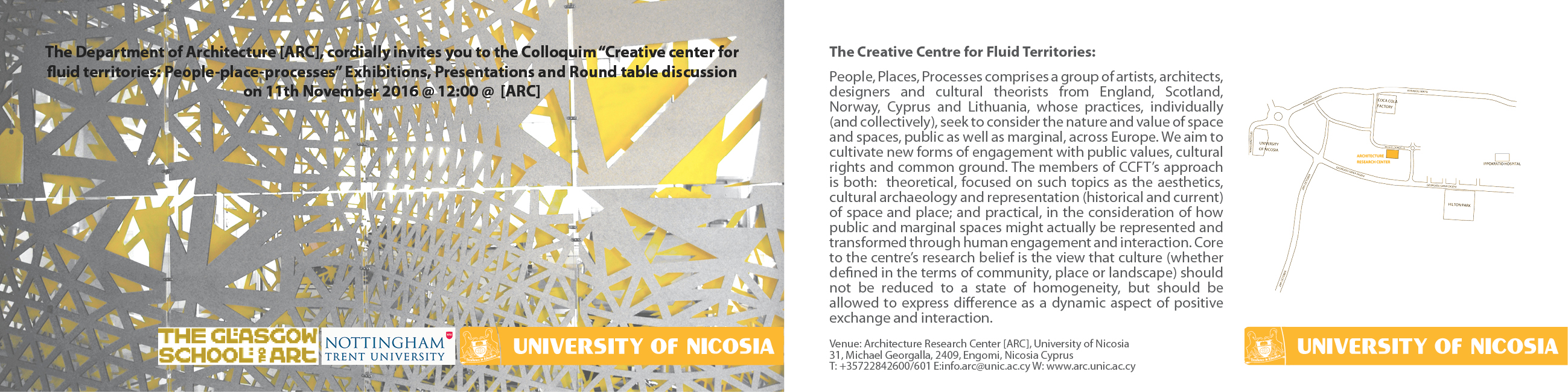 Readings from the 'Coffee Letters'Brind, Susan and Harold, Jim (2016) Readings from the 'Coffee Letters'. In: Creative Centre for Fluid Territories: People, Places, Processes - Colloquium, 11 November 2016, ARC Gallery, Architecture Department, University of Nicosia, South Cyprus. |