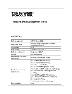 The Glasgow School of Art's Research Data Management PolicySiminson, Nicola Jane (2016) The Glasgow School of Art's Research Data Management Policy. The Glasgow School of Art, Glasgow. |