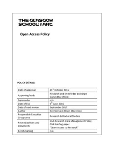 The Glasgow School of Art's Open Access PolicyStevenson, Alison and Neil, Ken (2016) The Glasgow School of Art's Open Access Policy. The Glasgow School of Art, Glasgow. |