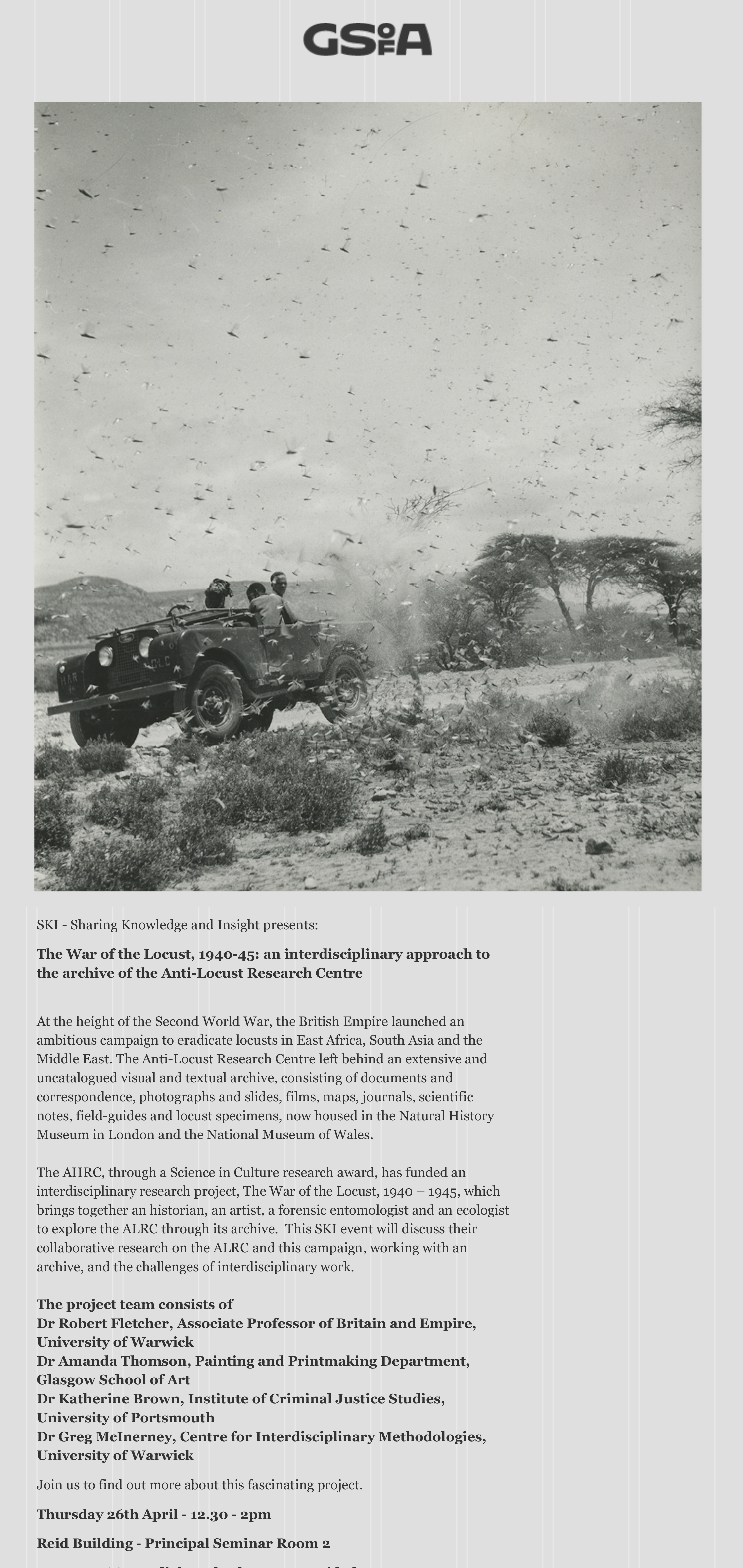 SKI - Sharing Knowledge and Insight presents: The War of the Locust 1940-45: an interdisciplinary approach to the archive of the Anti-Locust Research CentreThomson, Amanda, Fletcher, Rob, McInerney, Greg and Brown, Kat (2018) SKI - Sharing Knowledge and Insight presents: The War of the Locust 1940-45: an interdisciplinary approach to the archive of the Anti-Locust Research Centre. In: The War of the Locust, 1940 - 1945: an interdisciplinary seminar, 26 April 2018, Glasgow School of Art. |