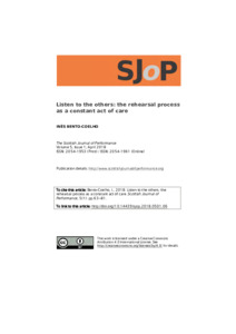 Listen to the others: the rehearsal process as a constant act of careBento-Coelho, Inês (2018) Listen to the others: the rehearsal process as a constant act of care. Scottish Journal of Performance, 5 (1). pp. 63-81. ISSN 20541953 |