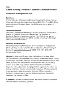 Artists Running: Fifty Years of Scottish Cultural DevolutionBrown, Dan, Jackson, Deborah and Mulholland, Neil (2018) Artists Running: Fifty Years of Scottish Cultural Devolution. Visual Culture in Britain, 19 (2). pp. 139-167. ISSN 1471-4787 |