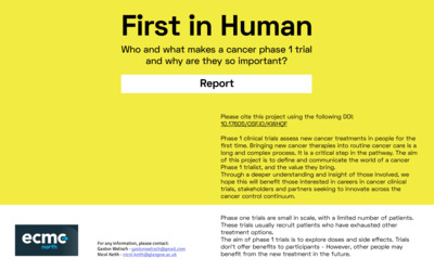 Welisch, Gaston, Twelves, Chris, Plummer, Ruth, Evans, Jeff, Danson, Sarah, Syemonides, Stefan, Halsey, Chris, Rob, Jones, Hanna, Catherine, Gallagher, Peter, Walls, Gerard, Taylor, Kirsty, Barnett, Shelby, Forde, Caroline, White, Mark, Williams, Chris, El Badri, Salma, Bong'eni, David Chipole and Keith, Nicol (2021) First in Human: Who and what makes a cancer phase 1 trial and why are they so important? Project Report. Open Science Framework.