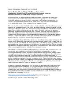 Interior Archipelago - postcards from our islandsWeinthal, Lois, Macklin, Patrick, Liang, Wen and Huang, Alice (2022) Interior Archipelago - postcards from our islands. In: Interiors in the Era of Covid-19: Interior Design between the Private and the Public Realms. Bloomsbury Visual Arts, pp. 247-258. ISBN 9781350294257 (online) |