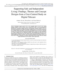 Supporting Safe and Independent Living: Findings, Themes and Concept Designs from a User-Centred Study on Digital TelecareTaylor, Andrea, Pizey, Hugh and Whittet, Craig (2022) Supporting Safe and Independent Living: Findings, Themes and Concept Designs from a User-Centred Study on Digital Telecare. Interacting with Computers, 3 (4). pp. 367-379. ISSN Print: 0953-5438; Electronic: 1873-7951 |