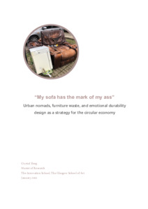 “My sofa has the mark of my ass”: Urban nomads, furniture waste, and emotional durability design as a strategy for the circular economyZeng, Crystal (2022) “My sofa has the mark of my ass”: Urban nomads, furniture waste, and emotional durability design as a strategy for the circular economy. MRes thesis, The Glasgow School of Art. |