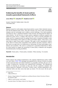 Evidencing the benefits of cluster policies: Towards a generalised framework of effectsWilson, James, Wise, Emily and Smith, Madeline (2022) Evidencing the benefits of cluster policies: Towards a generalised framework of effects. Policy Sciences, 55. pp. 369-391. ISSN 0032-2687 (print); 1573-0891 (electronic) |