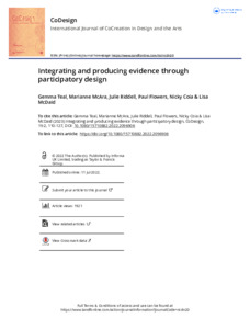 Integrating and Producing Evidence through Participatory DesignTeal, Gemma, Mcara, Marianne, Riddell, Julie, Flowers, Paul, Coia, Nicky and McDaid, Lisa (2022) Integrating and Producing Evidence through Participatory Design. CoDesign, 19 (2). pp. 110-127. ISSN 1571-0882 |