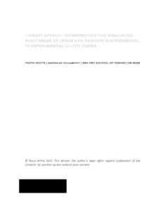‘I Craft Affect.’ Interpreting the Emaciated Body Image of Jesus and Fashion's Supermodel in Experimental Cloth FormsWhite, Tanya (2022) ‘I Craft Affect.’ Interpreting the Emaciated Body Image of Jesus and Fashion's Supermodel in Experimental Cloth Forms. PhD thesis, The Glasgow School of Art. |