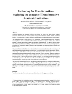 Partnering for Transformation - exploring the concept of Transformative Academic InstitutionsSmith, Madeline, Canto-Farachala, Patricia and Wise, Emily (2022) Partnering for Transformation - exploring the concept of Transformative Academic Institutions. In: Academic and Practitioner Proceedings of the 2022 UIIN Conference Series: Challenges and Solutions for Fostering Entrepreneurial University-Industry Engagement, Entrepreneurial & Innovative Universities and Collaborative Innovation. Academic and Practitioner Proceedings of the UIIN Conference Series, 10 . University Industry Innovation Network, Amsterdam. |
