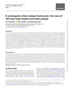 A salutogenic urban design framework: the case of UK local high streets and older peopleBrunelli, Luca, Smith, Harry and Woolrych, Ryan (2022) A salutogenic urban design framework: the case of UK local high streets and older people. Health Promotion International, 37 (5). pp. 1-17. ISSN Print: 0957-4824; Electronic: 1460-2245 |