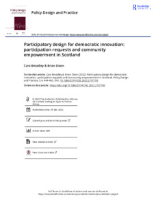 Participatory design for democratic innovation: participation requests and community empowerment in ScotlandBroadley, Cara and Dixon, Brian (2022) Participatory design for democratic innovation: participation requests and community empowerment in Scotland. Policy Design and Practice, 5 (4). pp. 444-465. ISSN 2574-1292 |