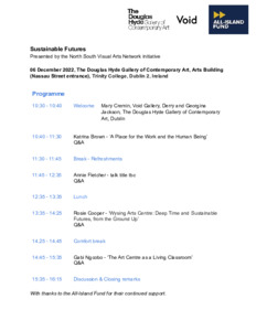 A Place for the Work and the Human BeingBrown, Katrina (2022) A Place for the Work and the Human Being. In: 'Sustainable Futures', 6 December 2022, Douglas Hyde Gallery, Trinity College, Dublin. |