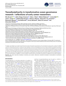 Transdisciplinarity in transformative ocean governance research - reflections of early career researchersStrand, Mia, Ortega-Cisneros, Kelly, Niner, Holly J, Wahome, Michel, Bell, James, Currie, Jock C, Hamukuaya, Hashali, La Beianca, Giulia, Lancaster, Alana M S N, Maseka, Ntemesha, McDonald, Lisa, McQuaid, Kirsty, Samuel, Marly M and Winkler, Alexander (2022) Transdisciplinarity in transformative ocean governance research - reflections of early career researchers. ICES Journal of Marine Science, 79 (8). pp. 2163-2177. ISSN Print: 1054-3139; Electronic: 1095-9289 |