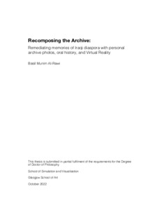 Recomposing the Archive: Remediating memories of Iraqi diaspora with personal archive photos, oral history, and Virtual RealityAl-Rawi, Basil Munim (2022) Recomposing the Archive: Remediating memories of Iraqi diaspora with personal archive photos, oral history, and Virtual Reality. PhD thesis, The Glasgow School of Art. |
