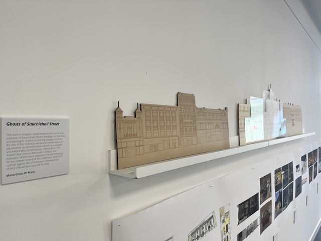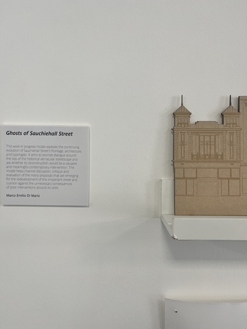This work in progress model explores the continuing evolution of Sauchiehall Street’s frontage, architecture, and typologies. It aims to prompt dialogue around the loss of the historical vernacular streetscape and ask whether its reconstruction would be a valuable and meaningful contemporary intervention. The model helps channel discussion, critique and evaluation of the many proposals that are emerging for the redevelopment of this important street and cushion against the unnecessary consequences of prior interventions around its orbit.