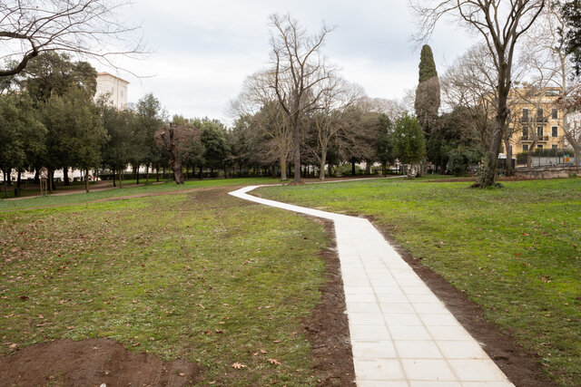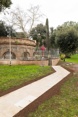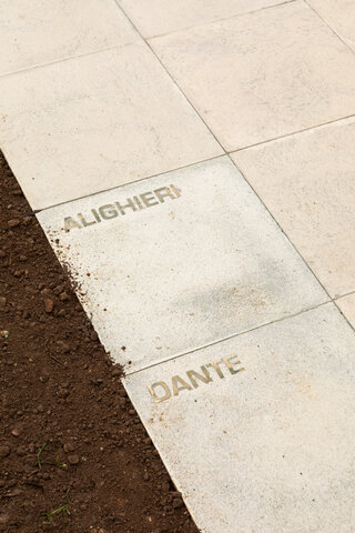 | Abstract: | Public artwork commissioned for Lavinia exhibition of contemporary art developed in response to the restoration of the 17th century Loggia dei vini, Villa Borghese, Rome. 'Primo gusto' features works by: Ross Birrell & David Harding, Monika Sosnowska, Gianni Politi, Enzo Cucchi, Piero Golia, Virginia Overton. For the exhibition, Ross Birrell & David Harding developed Love (Dante Desire Path) a poetry path text installation which follows the length of a 100m 'desire path' through the historic Villa Borghese gardens, from the Via dell’Uccelliera to the Loggia dei vini, built between 1609 and 1618 to a design by architect Flaminio Ponzio. The path consists of a quotation from Dante Alighieri's La Vita Nuova (1294) reproduced both in Italian and English in cast bronze lettering inlayed into concrete slabs (produced in Sicily and mixed with volcanic ash). The quotation from Dante reads: '... there was no man mine enemy any longer; and such warmth of charity came upon me that most certainly in that moment I would have pardoned whosoever had done me an injury; and if one should then have questioned me concerning any matter, I could only have said unto him "Love".' The selection of the text respond to the theme of 'Agape' as the highest form of love - a theme evoked in Harding's previous poetry paths commissioned for documenta 14 in Athens and Kassel in 2017 and which responded to the refugee crisis in the wake of the Syrian Civil War. In the present context of Rome, the Dante text is selected as a response to the ethical challenge for future peace and resolution presented by the scale of civilian suffering in the concurrent wars in Gaza and Ukraine. The typeface for the bronze letters is Eurostile, a geometric sans serif font designed in 1962 by Edgar Novarese for the Nebiolo foundry in Turin. The use of this popular font associated with Sci-Fi fiction and film was selected as a typeface by an important Italian designer who, during WWII had joined left-wing partisans fighting against the German Nazi's (today the word 'proletariat' is used for the Eurostile sample text online) as an historical contrast to the 17th Century historical context of the wealth, power and cultural influence of the Borghese family of Cardinals and Popes - and patrons of artists such as Caravaggio and Bernini. Image Credits: Daniele Molajoli |