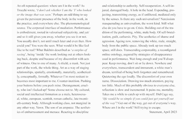 'I don't ask whether I am the 'I' who looked or the image that was seen, the man who acted or the man who thought about the act', writes Alexander Trocchi in his novel ‘Young Adam’, published seventy years ago in 1954. In ‘the practice, as was, the practice, as is’, I trace and retrace steps, thoughts, and actions I have made and unmade, undertaken and erased, imaged and imagined, over the 35 years I have been engaged in performance art as a self-reflexive meta-methodology of enquiry into what it means to be here and there, then and now. Ideology, sensory deprivation, ceremony, emptiness, menace, suicide, nomadism, violence, repetition, ritual, nakedness, memory, territory, immortality, invisibility, divisibility and indivisibility, spatialisation, religion, utopia, heroism, outsideness, historicisation, regret, distance, peace, digitising, encoding and recoding, recording and rerecording are subjects and methods at once. For most of the time, I have been an educator thinking of teaching and learning, in its actual sense and unfolding, as central to ‘the practice, as was, the practice, as is’. Teaching, learning, and research are acts of, sometimes unnamed and unnameable, enquiry, and the challenge can be to articulate that enquiry underpinning ‘the practice, as was, the practice, as is’. This performance lecture is my latest attempt. I think I now know, again. |