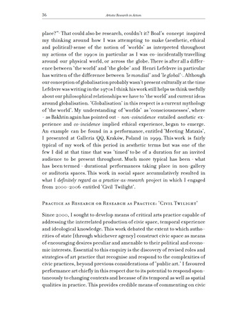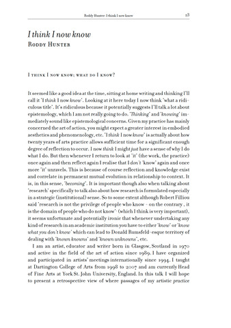 Hunter, Roddy (2011) I think I now know. In: Artistic Research in Action: Proceedings of CARPA 2 - Colloquium on Artistic Research in Performing Arts. The Publication Series of The Theatre Academy Helsinki, 42 . Theatre Academy Helsinki, Helsinki, pp. 23-48. ISBN 9789529765621