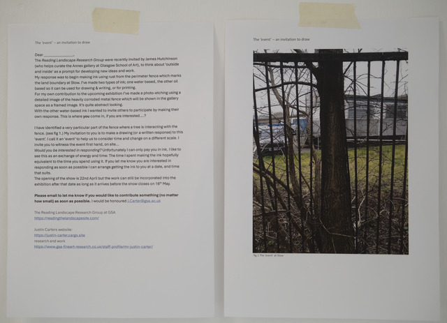 | Additional Information: | This work formed part of the 'Practicing Landscape: Field Notes' exhibition (22nd April - 16th May, 2025) in the Annex Gallery, Stow Building (GSA). It was initiated by curator James N. Hutchinson who invited the Reading Landscape research group to respond to the idea of site both inside the gallery and beyond it. My initial response was to make ink using rust harvested from the railings that demarcate the land occupied by Stow Building. The ink was then used to make a photo etching which depicts the heavily corroded railing which I called 'Untitled (rust)'. The image is representational but looks abstract. I also made another ink using rust from the railings, but this time boiled in water with oak galls. I invited a number of artists and writers to respond to this ink using a prompt in the form of an image I had taken of a tree forcing it's way through the metal railings: "My invitation to you is to make a drawing (or a written response) to this ‘event’. I call it an ‘event’ to help us to consider time and change on a different scale. I invite you to witness the event first hand, on site…" (quote taken from invitation letter). I received ink based responses from six people which were then integrated into the exhibition during the run of the show. They included drawings, text and video from prof. Peter Szendy, Cat Tams, Dr Frances Robertson, Dr. Jim Harald, Peter McCaughey and Dr. Edwina FitzPatrick. Peter Szendys response written in ink from the metal railing read: "The tree pushes aside the grid. The parallels are no longer parallel. Instead of regular metallic striations, what comes into view, carried by the bark, are like ribs. Writing so fine and nervous that no rule Reading Landscape research group members who were part of the larger group exhibition included: Susan Brind & Jim Harold, with Alex Hales / Justin Carter / Anne-Marie Copestake / Alan Currall Elizabeth A. Hodson & Emily Joy / Conor Kelly / Christina McBride / Mick McGraw / Michael Mersinis / Nalini Caroline Paul / Lesley Punton / Fiona Robertson / SEA ARCHIVE / Ross Sinclair Catherine M. Weir |