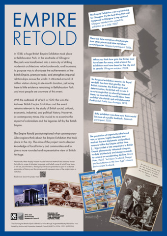 | Additional Information: | This project resulted in a range of Knowledge Exchange materials are designed to encourage the use of outputs from the “Decolonising the British Empire Exhibition of 1938 through Augmented Reality Narratives” project. These include: Lesson plans and resource for use in schools and with youth organisations. The materials comprise: 1) Lesson plans written by Jacqueline John, a teacher who was a partner on the project. Lessons use project outputs and are themed as follows: • Scottish Identity. • Should we rebuild Tait's Tower? • Creative Writing, Untold Stories. • Work and Industry. • Expanding the learning. 2) A booklet of discussion prompts, themed around the Empire Exhibition of 1938. This was curated and written by Daisy Abbott. These lesson plans and worksheets are aimed at second level (approx. P5 - P7 and about age 8 - 11 years). However, they could be adapted for use at higher levels too. Workshop templates for recreating the project methodology for other heritage sites. Materials comprise: Adaptable workshop templates for a polyvocal exploration of a historical event/period (Workshop template, Consent form, Participant Information Sheet, Workshop slides 1, Workshop slides 2, Mapping activity, Story activity). A booklet of discussion prompts and visual elicitation material, for use with either schools or adult workshops. |
