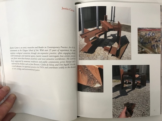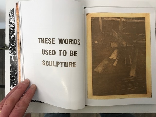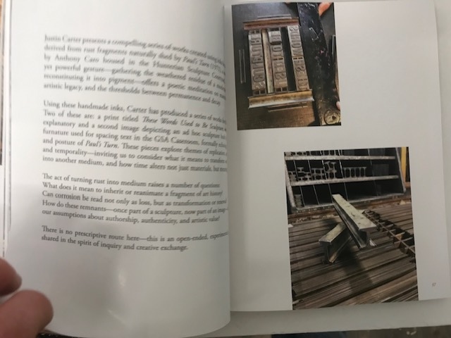 | Abstract: | Following my showing of the work 'Untitled (Rust)' at the Annex Gallery (part of the 'Field Notes' exhibition) I was invited to contribute work to a publication Do Rocks Remember Lava by curator Leo Hajducki (Director, Woom Room Workshops CIC). Her interdisciplinary research draws on her background in Philosophy and Politics, exploring the intersections of materiality, sound, and ecological thought. In response to this invitation I made an eight page visual essay describing the research process around a current project 'Pauls Turn' where I had been transforming waste rust material from Anthony Caros sculpture 'Pauls Turn' (1971) into two types of ink - one for drawing and writing and the other for printing. I included in the visual essay photographs describing the research journey from harvesting waste material from the Hunterian Sculpture Courtyard where the work is displayed, to ink making, then printing. The two final printed works are displayed in the final two pages of the visual essay: 'Pauls Turn' (a photo etching) and 'These Words' (a printed text made in the case room) face each other in conversation, referencing the original sculpture and creating a space between image and text. The image itself imitates 'Pauls Turn' but is in fact made using the print furniture from the case room - small metal 'I' beams usually used to create space between the different lines and characters going to print. |
