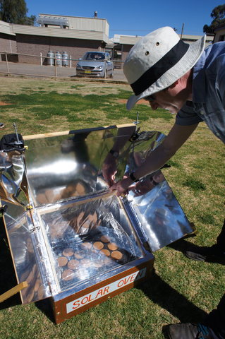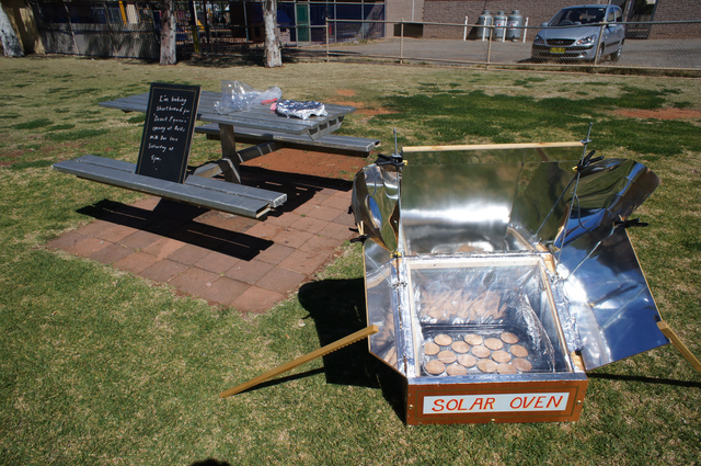 'Solar Oven' was designed, constructed and demonstrated in response to an invitation from Allan Giddy (Director, Environmental Research Initiative for Art, UNSW) to participate in the group project 'Desert Equinox', in Australia. An international group of artists explored issues surrounding climate change and sustainability through public art. Audience participation and awareness of contemporary art were identified as key challenges within the context of this project. My specific concept therefore developed out of this need to engage audiences directly within the ‘everyday’. The Solar Oven provided a movable ‘stepping-stone’ to many of the other exhibits in the project.