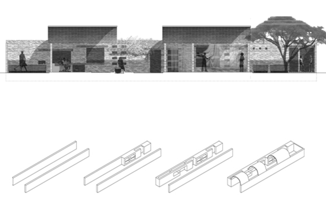 A design entered in international competition for low cost and skill-based self build housing in Luanda. The brief stipulated plot sizes and the requirement that the individual dwellings needed to be able to be combined successfully to form a cohesive settlement. The solution turns the rather inappropriate title on its head to invent a constructional system which gives users significant build freedom within certain parameters without the risk of the overall strategy unravelling. The resulting solution prototypes a building system capable of creating a series of open and covered spaces which address issues of territory, privacy, small holding lifestyle and architectural character within a Global South context.