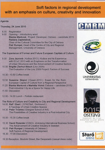 Trowles, Peter (2010) The Possibilities of Creative Industry in a Post-Industrial City. In: Soft Factors in Regional Development - with an emphasis on culture, creativity and innovation, 24-25 June 2010, Ostrava, Czech Republic.