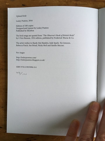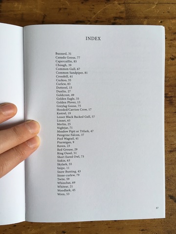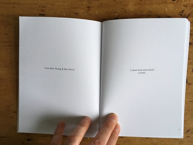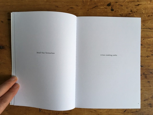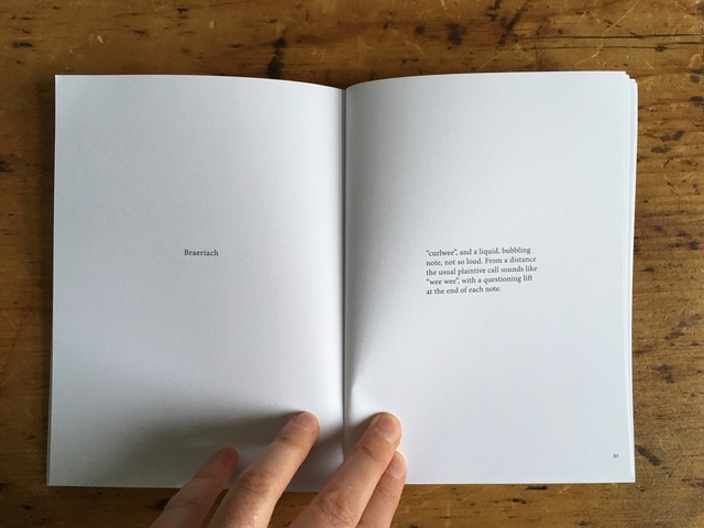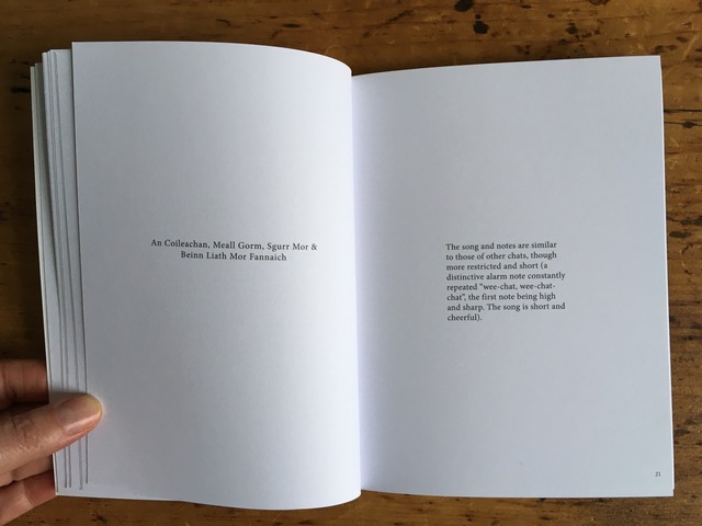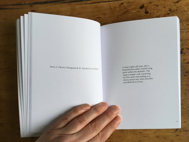 An artist book that explores how we translate birdsong into the English language. The book makes a correlation between the names of various mountains, with the implication initially being that this is where the birds have been observed, but which also suggests a link between the sounds made and how we have named land in similarly descriptive terms through the Gaelic. There are also subjective pairings gleaned from my own interpretations and experiences of climbing the hills listed.