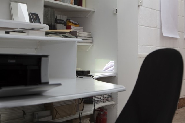| Abstract: | For the group exhibition ‘Dr Sinclair’s Drawer’, Sarah Tripp invoked an absent Administrator in the functioning office within Flat Time House (London). The art work produced by Tripp, titled ‘Youth Administrator’, consisted of the site specific installation of a looped HD video and a holographic foil blocked onto a digital print. The fictional character of the Administrator was invoked within Flat Time House: which was a residence for, and is an artwork by the renound British artist John Latham. John Latham’s house provided the physical and conceptual context for this group exhibition. The Youth Administrator’s hands were projected in miniature on the corner of the desk within the functioning office space and the words ‘Thank You’ were reversed, debossed in holographic foil and hung on the office wall. As the projection looped, the accompanying voice-over observed the character of the Administrator emerge through a small act of theft. ‘Dr Sinclair’s Drawer’ was curated by Flat Time House (London) and Book Works (London). The exhibition was accompanied by a publication featuring writing by the exhibitors and published by Book Works and Flat Time House. A limited edition of the foil blocked holographic prints is available from Book Works. |