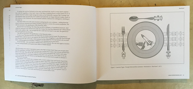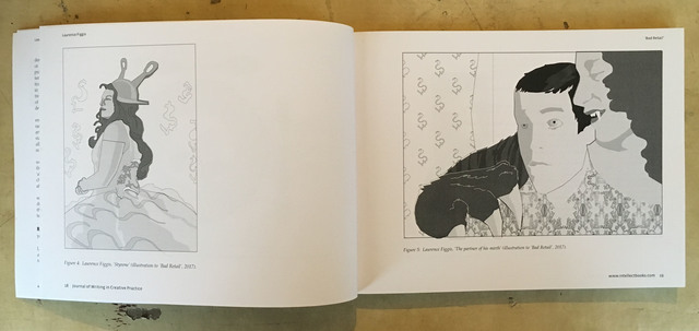 This article was published in a special edition of the Journal of Writing in Creative Practice Practice (subtitled Art-Writing, Paraliterature and Intrepid Forms of Practice), edited by Susannah Thompson and Laura Edbrook. The article took the form of a Preamble outlining my research field and methodology, and a piece of fictional art-writing, ‘Bad Retail’. The latter was first written to accompany a series of my own narrative paintings. The text was originally disseminated through a series of exhibitions in the form of printed handouts that were included alongside the visual works. The story evolved from a simultaneous investigation of two related devices in literature and painting: anachronism and collage. These terms are linked by an act of displacement: of objects from history and of images from their source. This compositional tendency is characteristic of late-eighteenth- and early-nineteenth-century romantic fiction, which often refuses to conform to (and remain within) accustomed genre categories. The aforementioned narrative was accompanied here by a series of illustrations based on the paintings and drawings that I produced in tandem with the text. The aim was to treat the journal submission as a form of ‘illuminated manuscript’, through which anachronism might be understood as both a verbal and a visual strategy.
