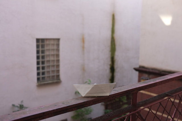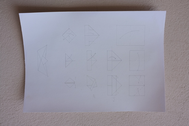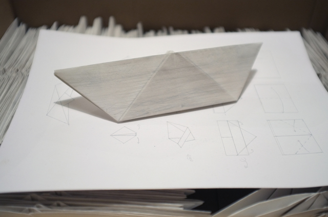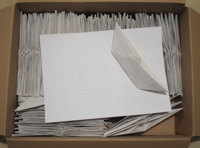 A collection of 100 paper boats, coated with white acrylic gesso. A silverpoint drawing of instructions.