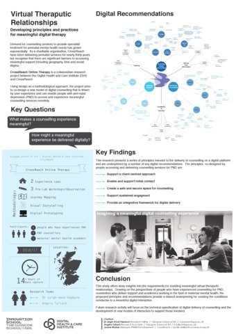 Hepburn, Leigh Anne, Tulloch, Angela and Walker, Jackie (2018) Virtual Theraputic Relationships: Developing principles and practices for meaningful digital therapy. In: Maternal Mental Health Scotland – Annual Conference, 14 May 2018, Glasgow, UK.