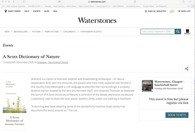 Thomson, Amanda (2018) A Scots Dictionary of Nature - Amanda Thomson in conversation with Robbie Guillory. Waterstones, Sauchiehall Street, Glasgow, 7 November 2018 [Show/Exhibition]